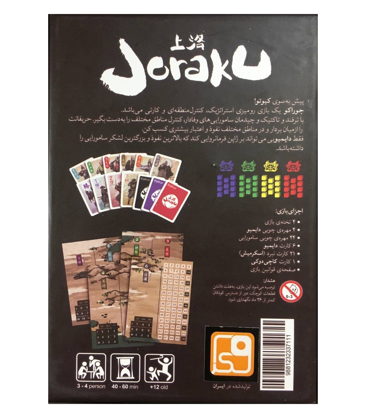 در این بازی بازیکنان با فریفتن یکدیگر و استفاده از سامورایی ها و قدرت نظامی خود، تلاش میکنند تا کنترل خود را بر روی نواحی مختلف ژاپن گسترش دهند و با کسب محبوبیت حکمرانی ژاپن را در دست بگیرند. بردگیم جوراکو Joraku یک بازی رومیزی استراتژیک با مکانیزم قلمروگیری است که با تم تاریخی و در دوران ژاپن عصر شوگان جریان دارد.